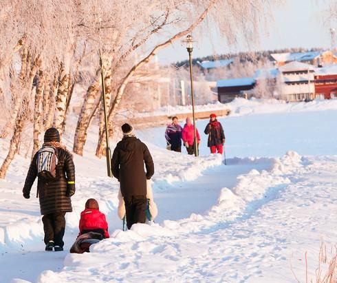 Bild på människor som går längs en gångväg i Luleå på vintern