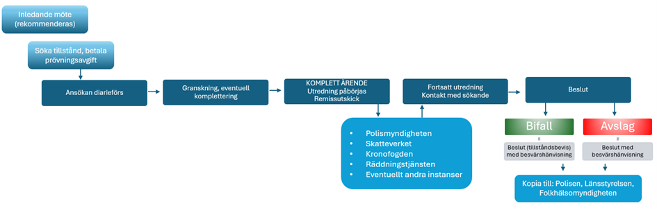 - Sök tillstånd och betala avgift – använd vår e-tjänst för ansökan, förbered de handlingar som ska skickas in. Avgiften ska betalas i samband med ansökan. (Läs mer under stycket Avgifter)