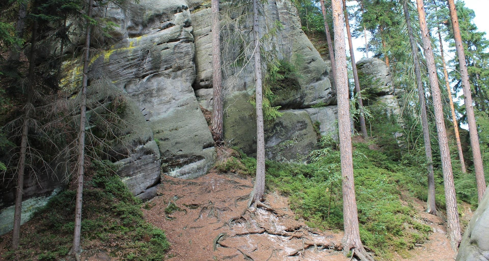 Bild på ett berg och stenblock med tallar som växer invid dem