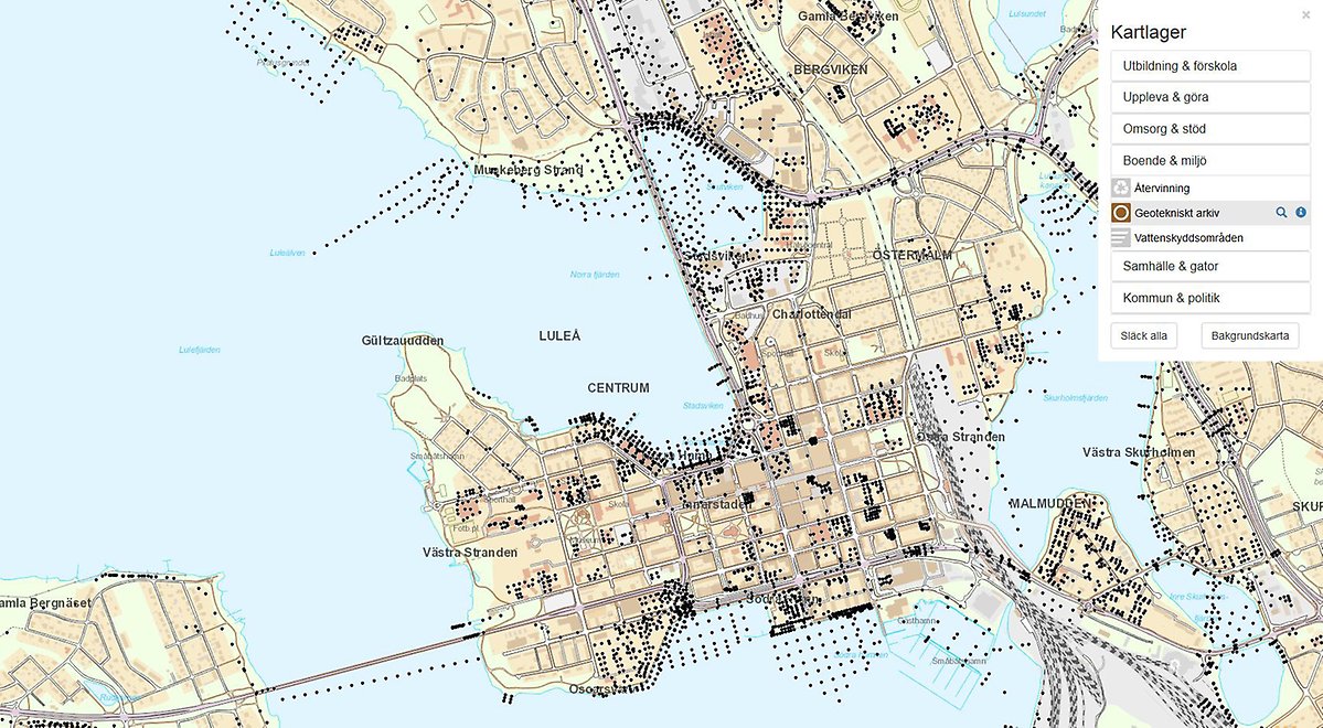 Arkivet innehåller samlad information om de geotekniska undersökningar som är utförda inom Luleå kommuns geografiska område, till exempel olika sonderingar, grundvattenrör och geotekniska- PM.