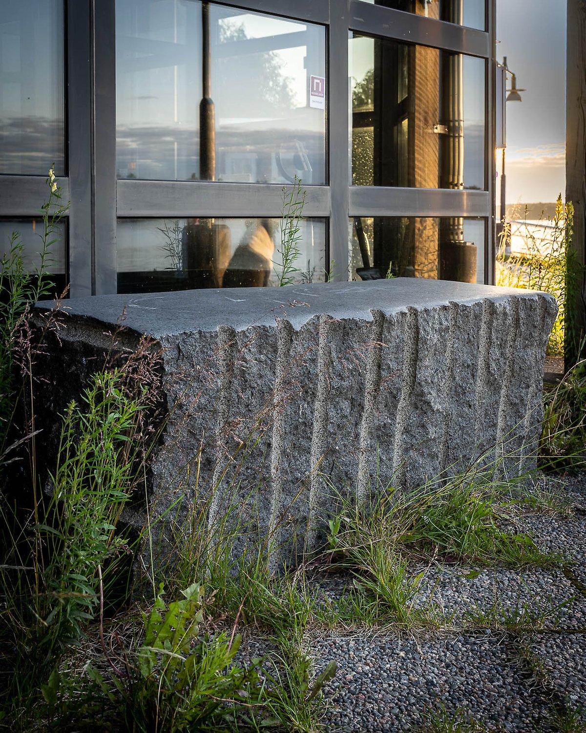 Bild av stenbänken som ingår i konstverket och som står bredvid ingången