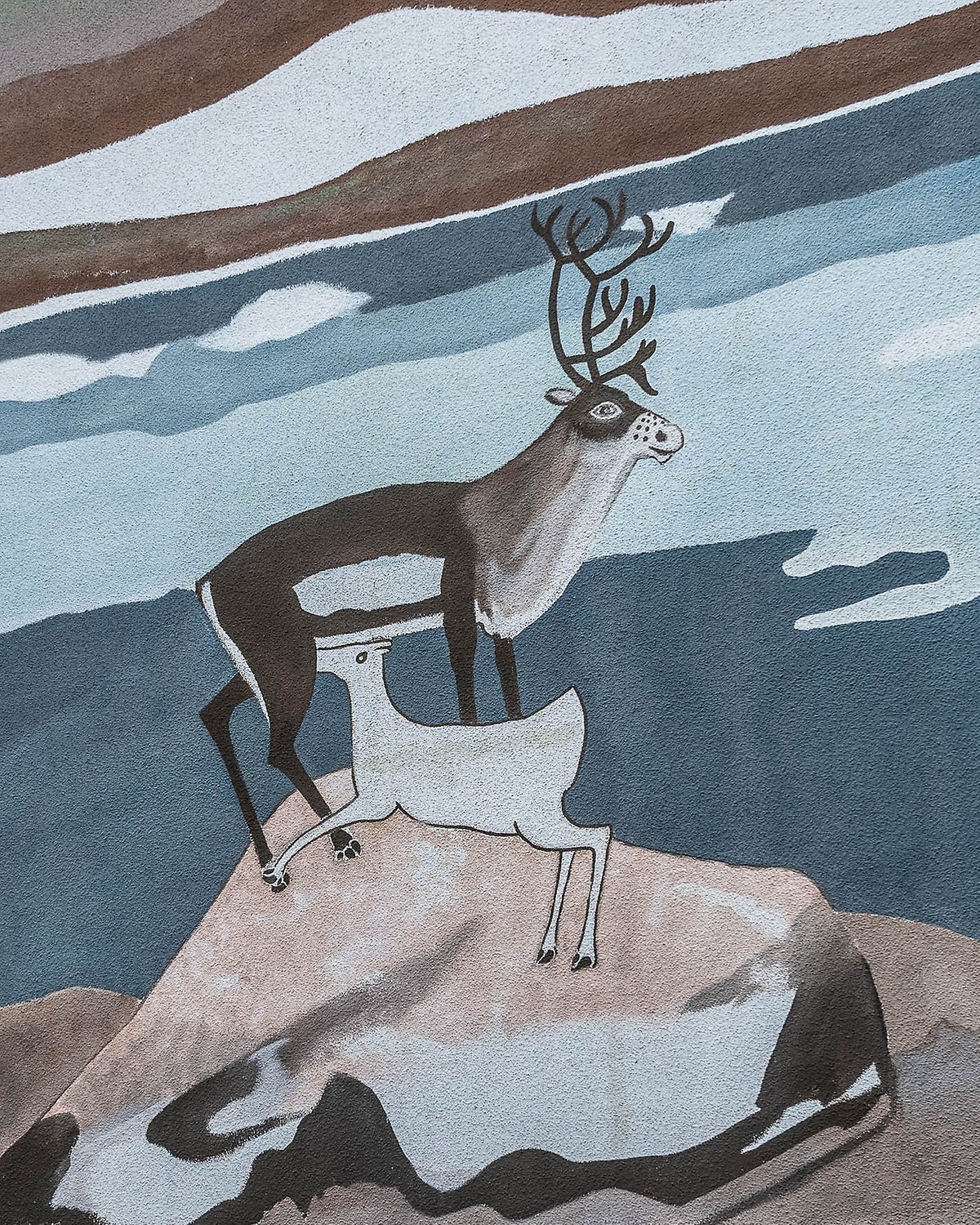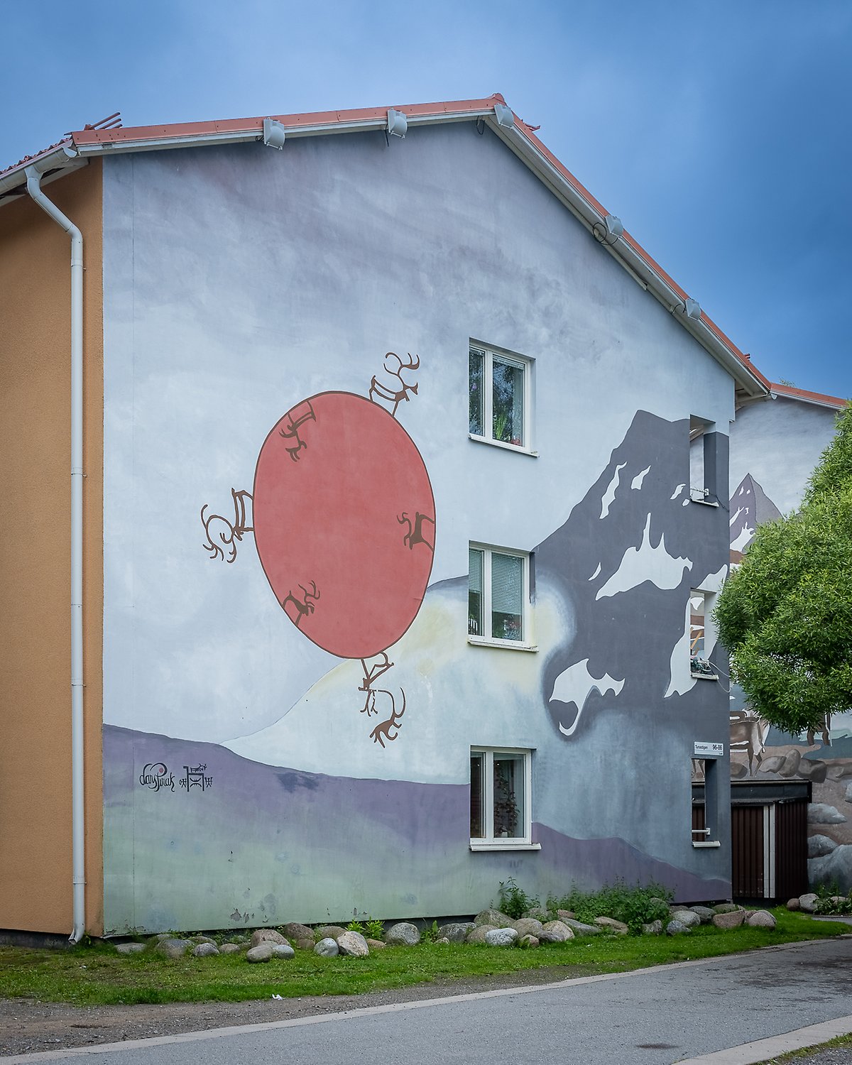 I Lars Piraks målningar på de två gavlarna av hyreshusen kan man se vad som var viktiga inspirationskällor för honom: Den mäktiga naturen i fjällen och den samiska kulturen. Kanske särskilt renen, som han upplevde har en inre dimension som han ville förmedla; som själens spegel och som en symbol för den samiska kulturen.