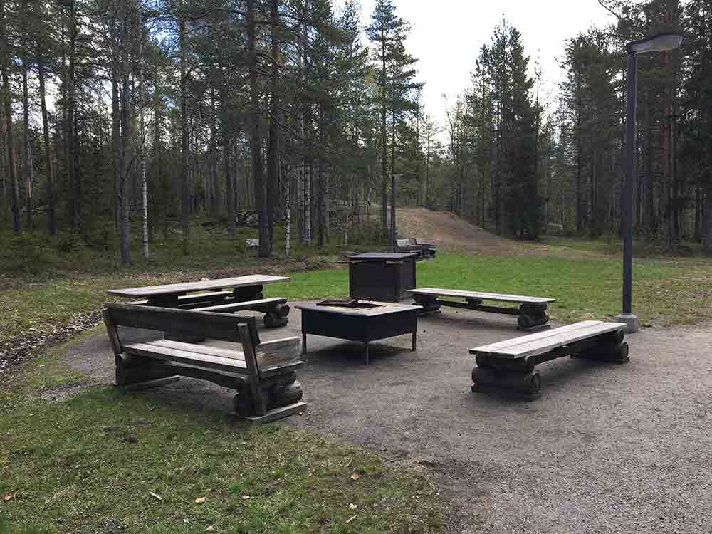 Här finns lekerbjudanden till både äldre och yngre barn, med en hög kompisgunga på en trefotsställning, klätternät och ett klättertorn med en tall växande igenom. Här finns även sandlåda och en rutsch för de yngsta. Med skogen, stora stenar och en backe för pulkaåkning intill finns det större ytor att leka på än bara själva lekplatsen. Här finns även bänkbord och grillplats med bänkar runt.